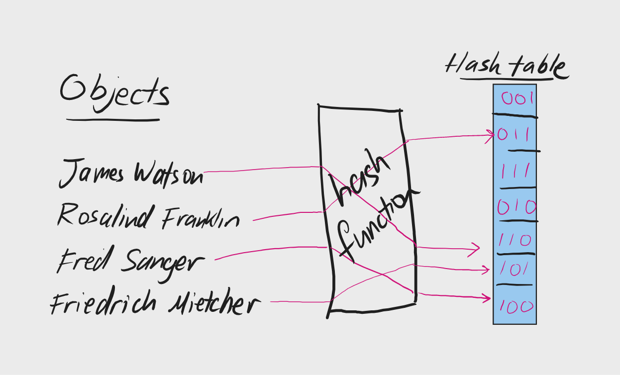 --- Remember: $4^k$ ``` > cbind(k=seq(1,20), combinations=4^seq(1, 20)) k combinations [8,] 8 65536 [9,] 9 262144 [10,] 10 1048576 [11,] 11 4194304 [12,] 12 16777216 [13,] 13 67108864 [14,] 14 268435456 [15,] 15 1073741824 [16,] 16 4294967296 [17,] 17 17179869184 [18,] 18 68719476736 [19,] 19 274877906944 [20,] 20 1099511627776 ``` High $k$ $\rightarrow$ high-dimensional vectors, sparsity --- ### Hashing > A hash function maps an object to a finite space - must be deterministic - should be very fast to compute - should reduce collisions Uses of hash functions 1. Hash table keys 2. Evaluating similarity (or identity) 3. Cryptography ---  --- ### Hash tables - provide $O(1)$ complexity for item access - Can store large objects for lookup with a key --- ### Cryptographic hash function - a subset of hash functions with particular purposes: - designed to go one way (hard to de-hash) - designed to avoid collisions - relies on the avalanche effect (small change in inputs leads to large change in output) --- ### md5 algorithm- "Message Digest" In 2011, the Internet Engineering Task Force (IETF) [advised in this document](https://tools.ietf.org/search/rfc6151) that > The published attacks against MD5 show that it is not prudent to use MD5 when collision resistance is required. --- ## MinHash MinHash uses hashing to determine similarity between two sets very quickly.